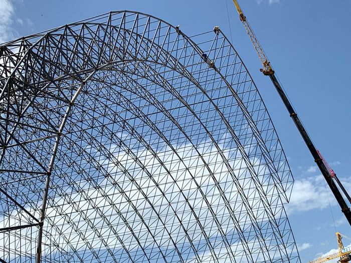 (2)网架加工前应对现场尺寸进行复测,确认无误后方可进行加工、安装;网架制作、运输、安装应遵守《空间网格结构技术规程》JGJ7-2010、《钢网架蛟河螺栓球节点》JG/T 10-2009、《钢网架蛟河螺栓球节点用高强度螺栓》 GB/T 16939-2016、《蛟河钢结构蛟河工程蛟河施工规范》 GB50755-2012、《蛟河钢结构蛟河工程施工质量验收标准》 GB50205-2020。
